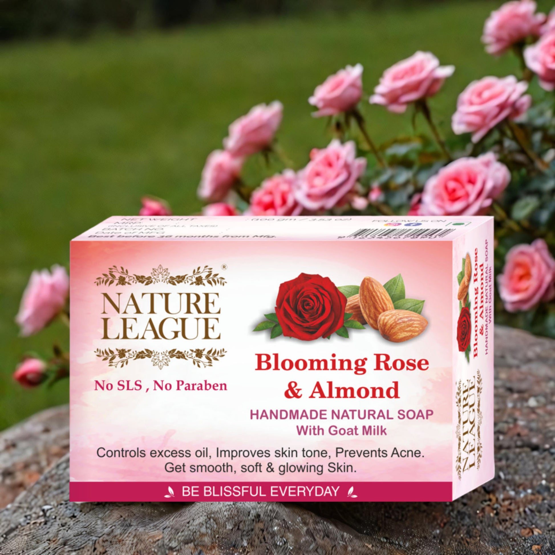 Nature League - Blooming Rose & Almond Handmade Natural Soap combine 100% natural ingredients to reinstate skinโs water content leaving the skin wonderfully hydrated & supple. This lustrous, divinely fragrant soap has amazing sensory that leaves the skin feeling soft and toned.
